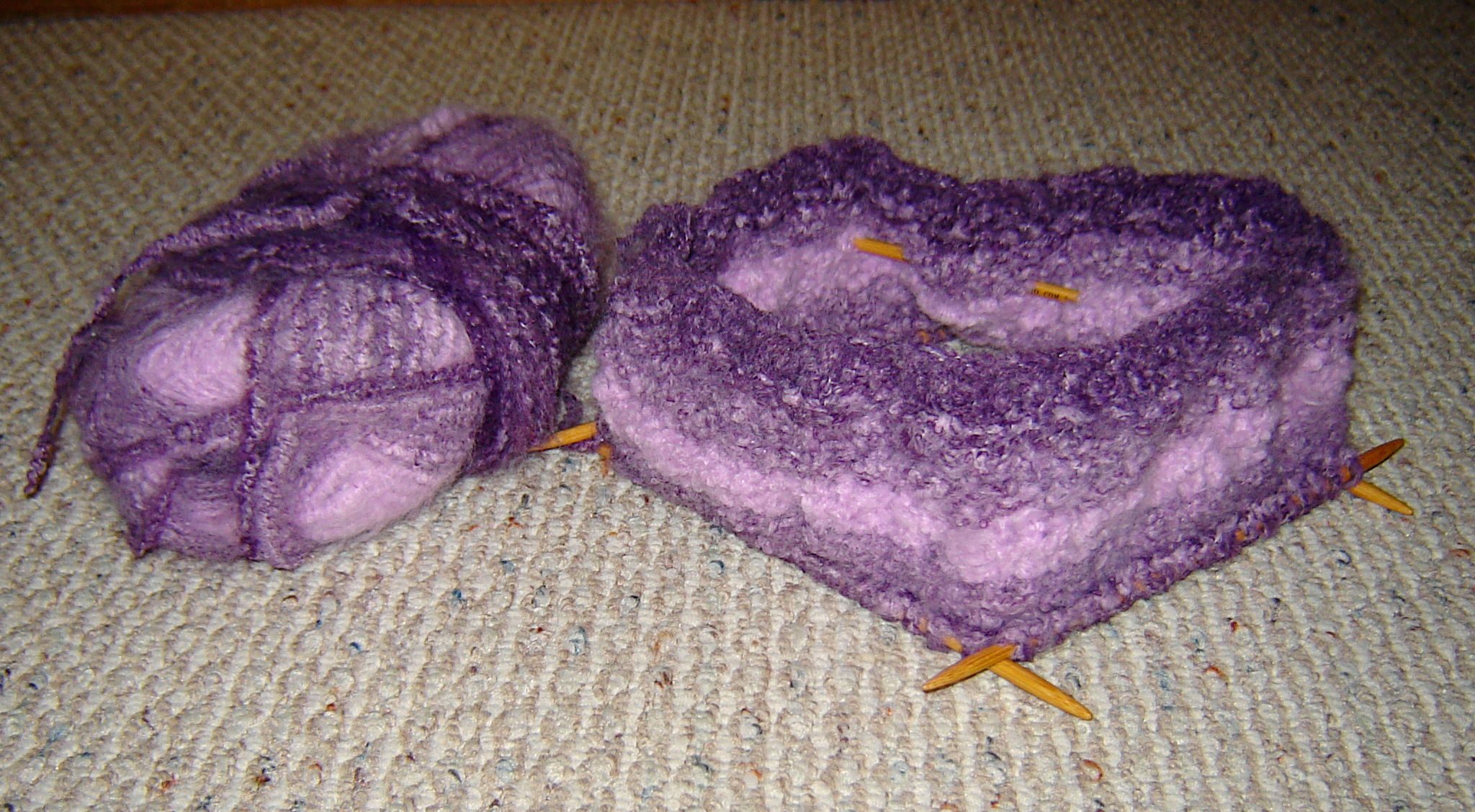 My buddy Dianne gave me some Masala yarn, a bumpy, fuzzy mohair blend of purpley stuff that was a royal pain to knit. It split and when my mind had wandered or I had put the work down, it was almost impossible to see where I had perled and where I had knitted, which is important if you’re trying to carry on a pattern.