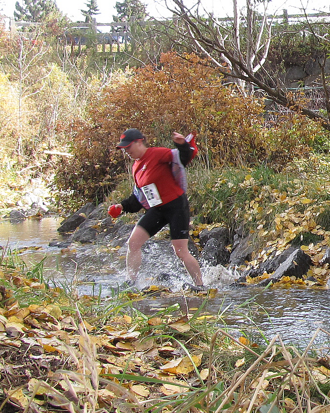 River Park Classic, photo courtesy of Dawn Henry (Pink Chick), Calgary Roadrunners. My legs are crossing the Elbow River, but my eyes are taking me up the opposing bank and ridge.
