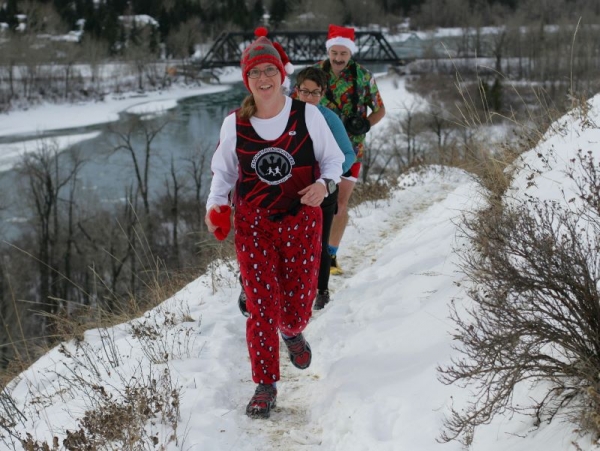After two weeks of running in very cold (-15C – -26C), often blizzard conditions, much sidewalk shoveling and no bike commuting, we were given December 14th, a lovely day of near-melting temperatures and even some sunshine. We were to race the Calgary Roadrunners Silver Springs XC, and it was a challenge to decide what to wear. This close to Christmas we like to be festive, so I pulled on a pair of penguin pajama pants over my leggings.
