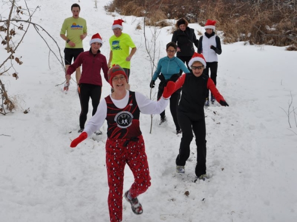 My favourite running buddy and I playfully tried to elbow each other out of the way as we jockeyed for position after the start. Dave I-H took advantage of our silliness and ran ahead. We sorted ourselves into single file along the ridge, and then plunged down a hill. The snow was plentiful, soft, and deep, so I bounded down past more cautious others with a big WHEEEEEE! If I had fallen it would have been a soft landing in the weeds and drifts.